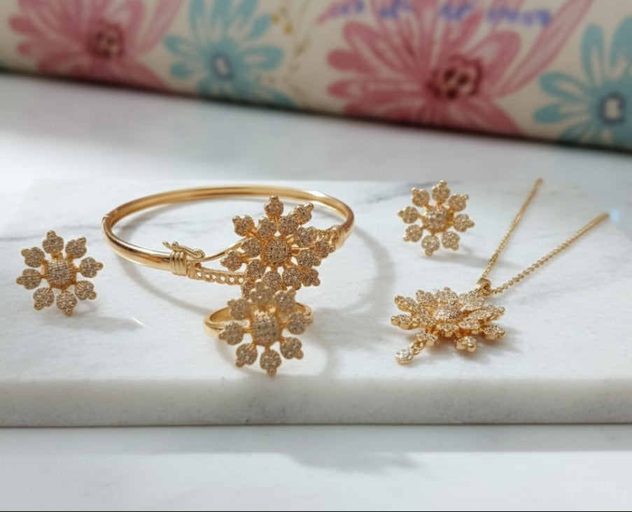 Elevate your elegance with our Luxury Gold Flower Jewellery Set, a premium 4-piece collection designed for women who love timeless beauty and refined detailing. This complete set includes a statement necklace, stunning floral drop earrings, an adjustable ring, and a beautifully crafted bangle — all featuring intricate flower-inspired designs and micro-pave crystal stones.